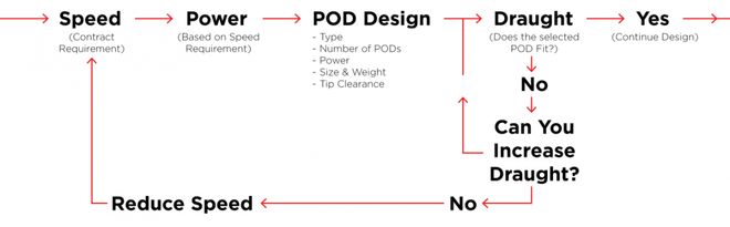 首先,吃水深度的考量变得至关重要。吊舱式推进器较低的功率密度意味着随着功率需求的增加,更大的装置往往需要更深的吃水,从而形成一个可能影响船舶规格的设计循环。当操作要求限制吃水深度时,设计师可能需要在合同速度方面做出妥协。