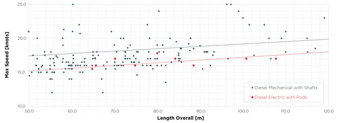 图2:速度与长度的关系,柴油机械传动带轴系与柴油电动传动带吊舱式推进器的对比。