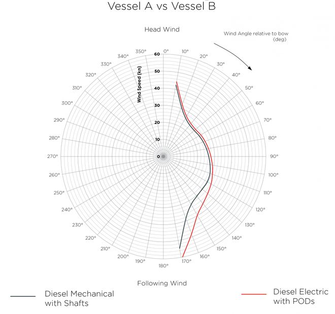 或许吊舱推进系统最引人注目的优势在于其出色的机动性。在航行中,全面测试表明,与传统的轴舵系统相比,吊舱推进器可将转向圆直径缩小多达38%。在港口进行近距离低速操作时,其改进的动态定位和定位保持能力更是胜过轴推进船舶,吊舱推进系统能够在比传统装置高30%的风速下保持位置。