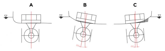 其次,尾板设计变得愈发重要。吊舱式推进器更倾向于采用U形截面(图4中的A布局),其纵倾角较小且外舷呈弧形,而弯曲或圆形截面可能会使安装变得复杂,并且可能需要倾斜,从而减少内部空间(B布局)。整流罩有助于适应过度倾斜,但通常会增加1%至2%的阻力(C布局)。