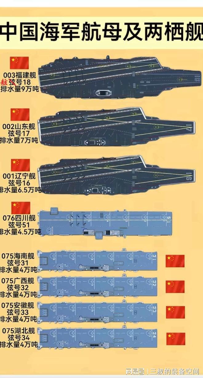 中国海军大型舰艇一览,仅就8艘军舰总吨位已经高达43万吨,已经超过欧洲一些大国。包括2艘6万吨级滑跃航母,1艘8万吨级电磁弹射航母,以及4万余吨076型两栖攻击,和3艘075型两栖攻击舰。